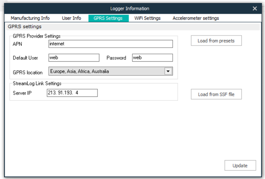 The window also contains an 'Update' button which allows the settings to be sent to the Logger.