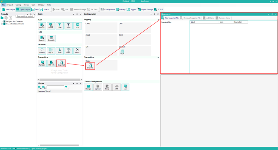 Drag the Snapshot tool in the Transmitting section in the configuration window.